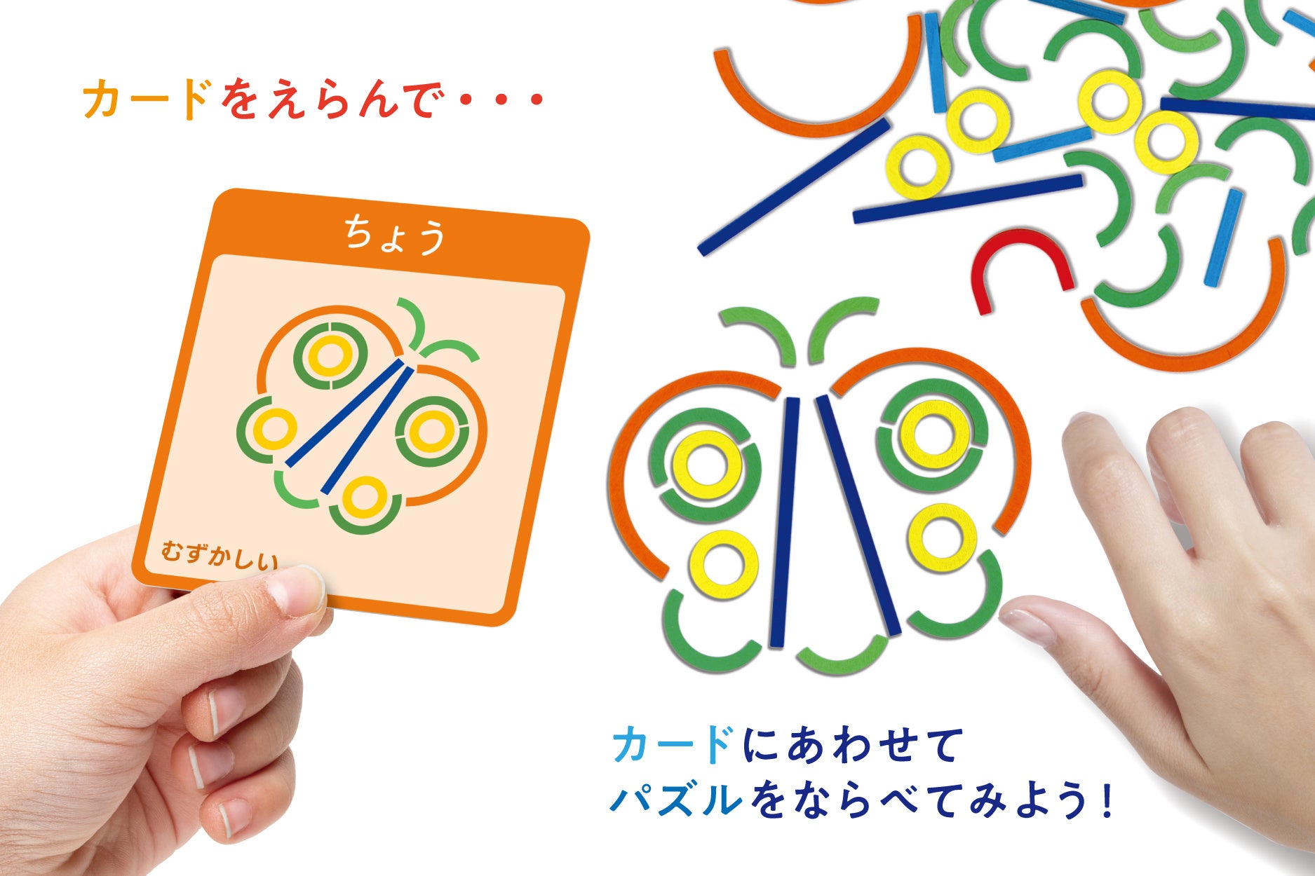 カードのお題には乗り物や動物など多種多様なモチーフをご用意!楽しく遊びながら集中力を伸ばせます。慣れてきたら、オリジナルの形にチャレンジ!お子さまの想像力を育む自由度の高いパズルです。