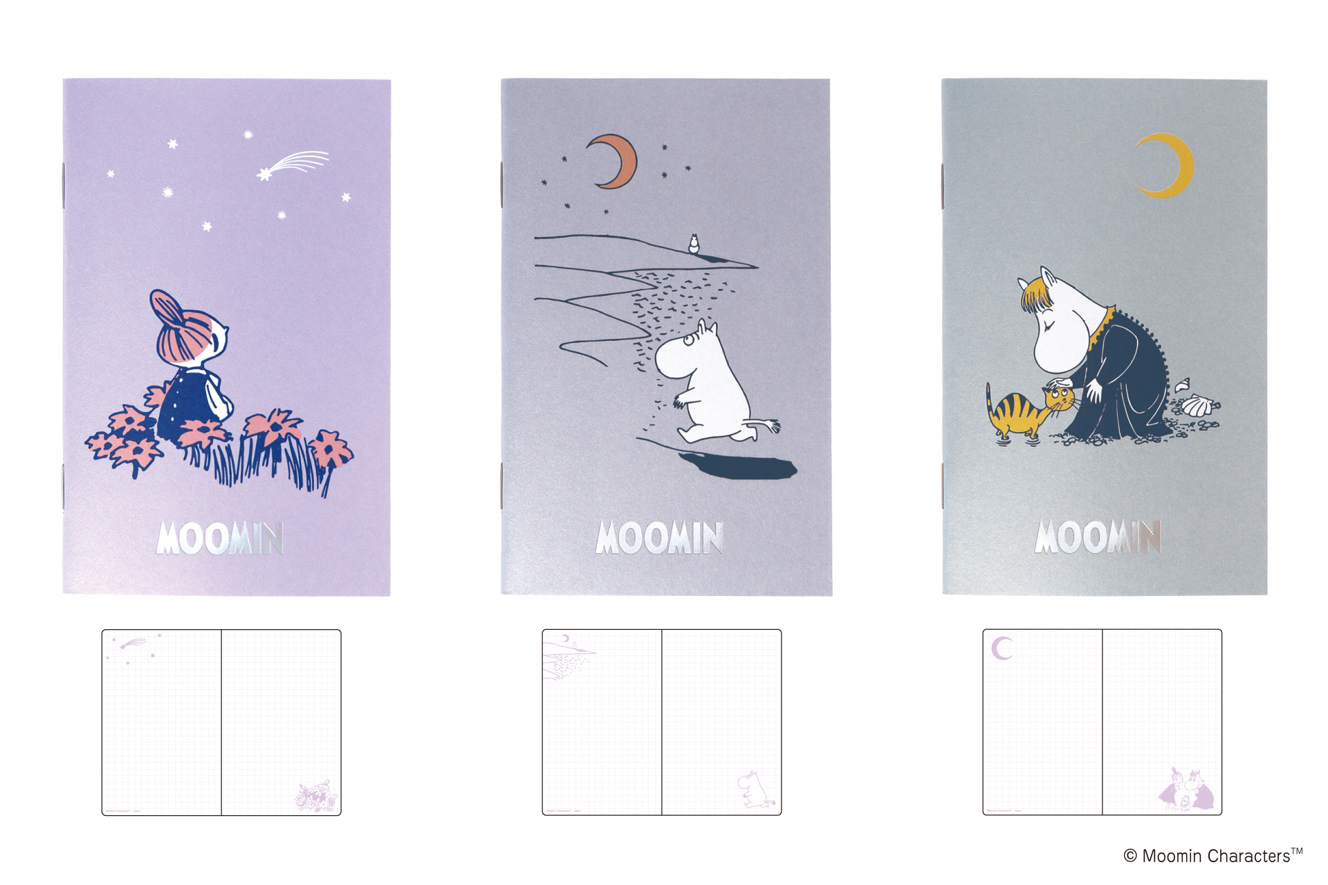 幻想的な夜空に広がるオーロラをイメージしたデザインのシリーズは、ムーミンたちが過ごす静かな夜のひとときを、やわらかな色合いときらめきの加工で表現しました。