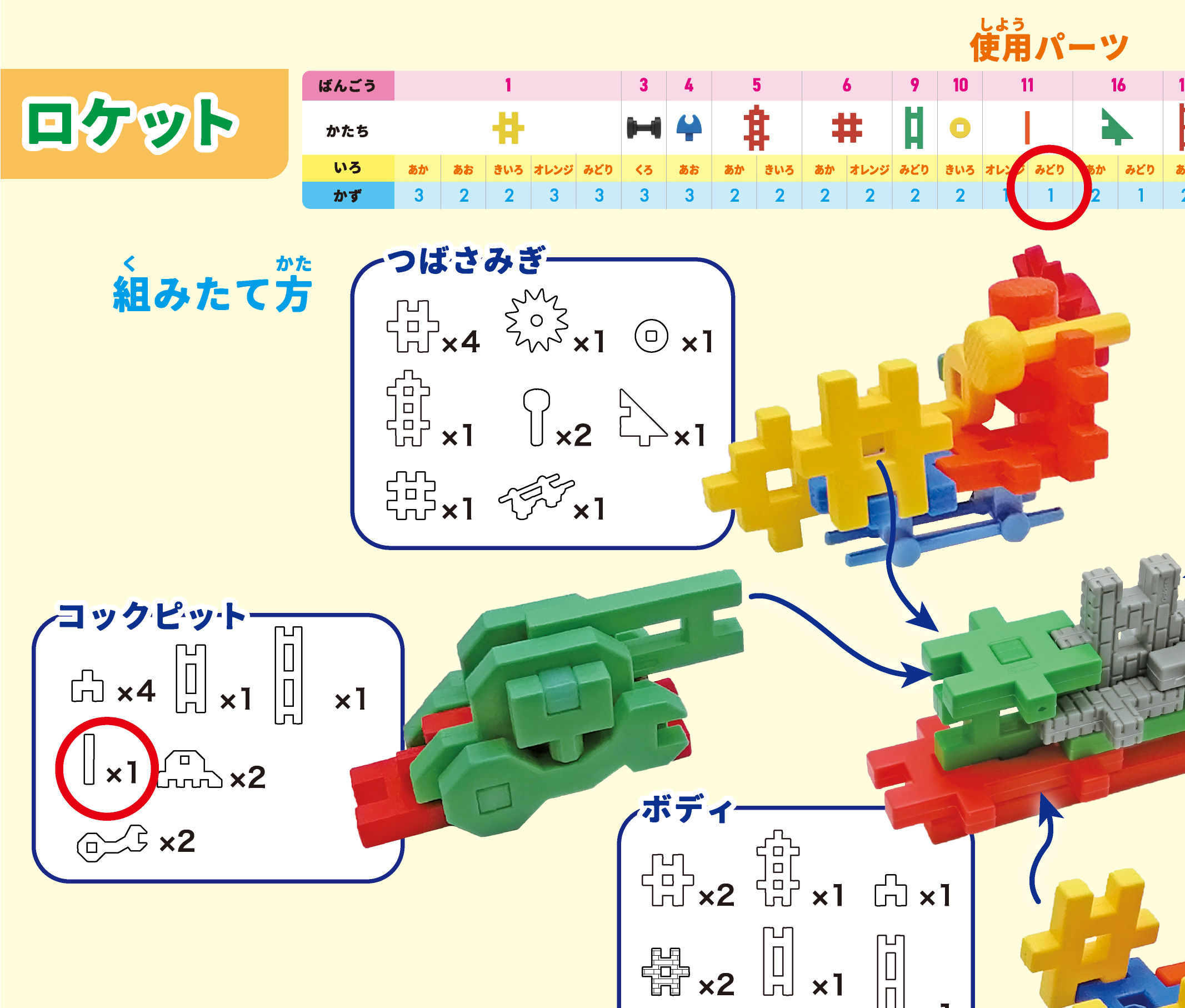 商品付属の「遊び方ガイド」に掲載されている作例、「ロケット」の使用パーツ数