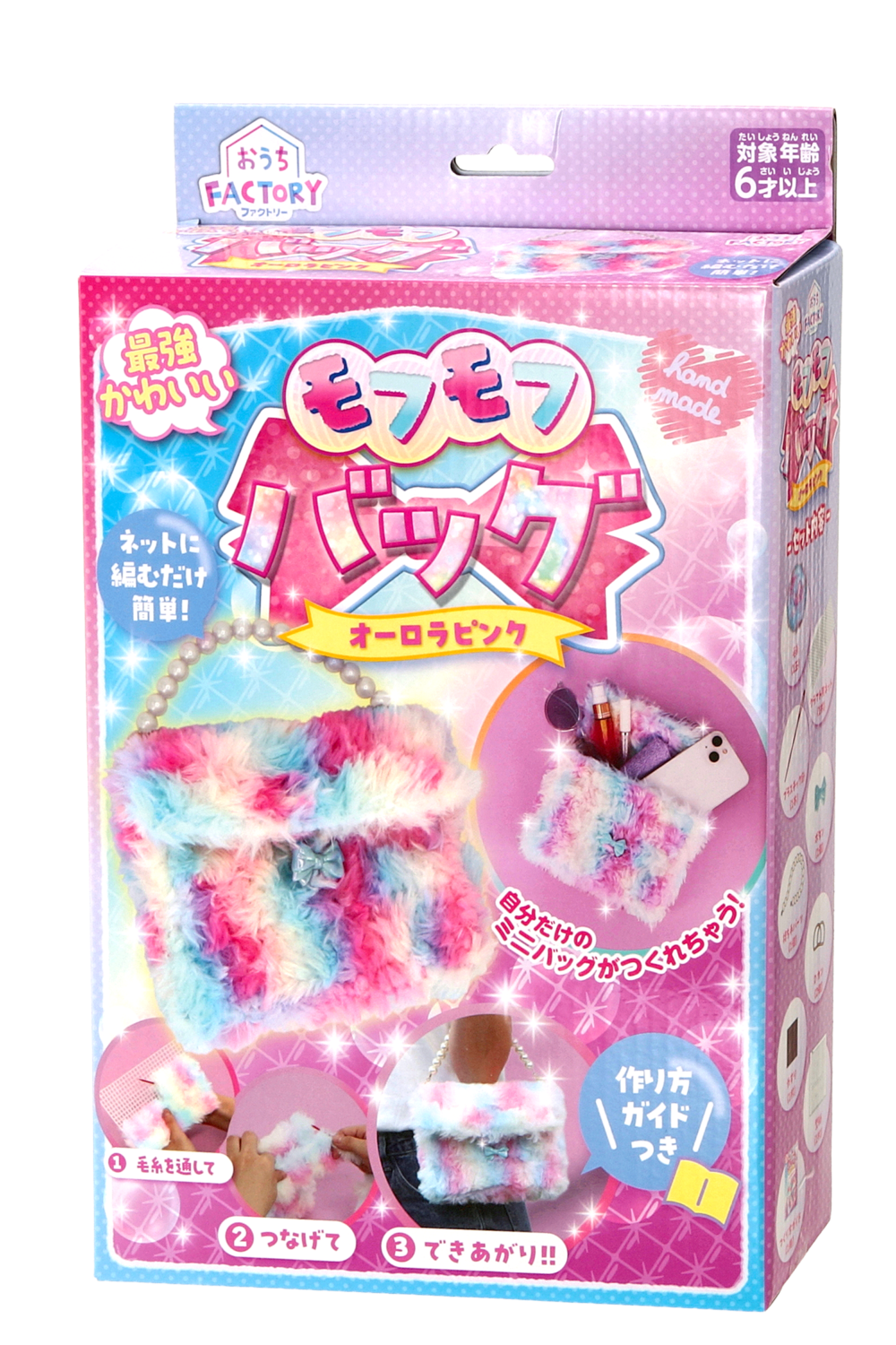 おうちファクトリーシリーズ第4弾。オーロラピンクのモコモコ毛糸が可愛い!クラフトネットに毛糸をあみつけるだけでオリジナルバッグがつくれちゃう!