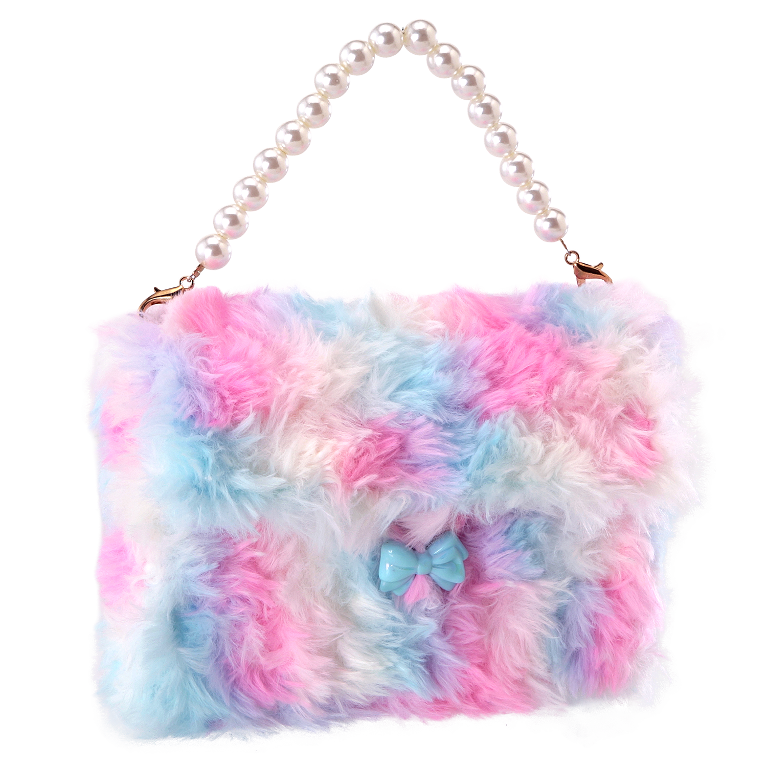 自分だけのモフモフバッグを作ってお出かけしよう。作り方冊子と作り方動画付き!スカイブルーのオーロラリボンがワンポイント!キラキラ可愛いパールの持ち手もついてるよ!