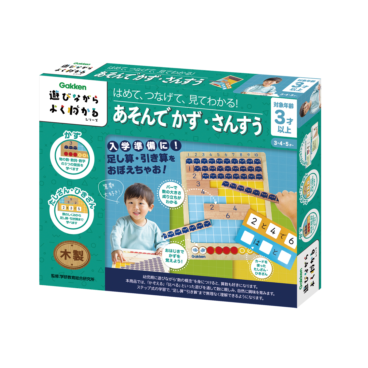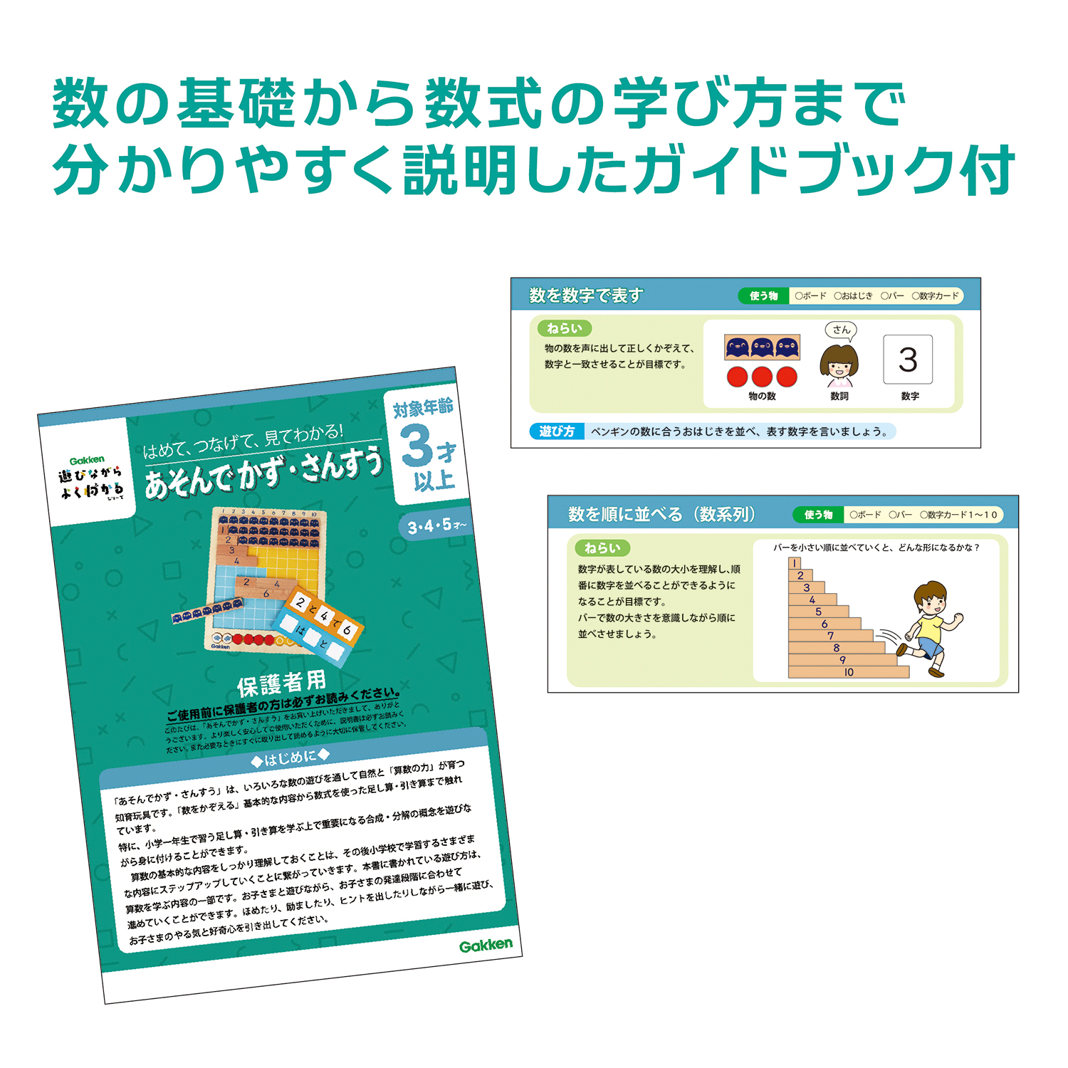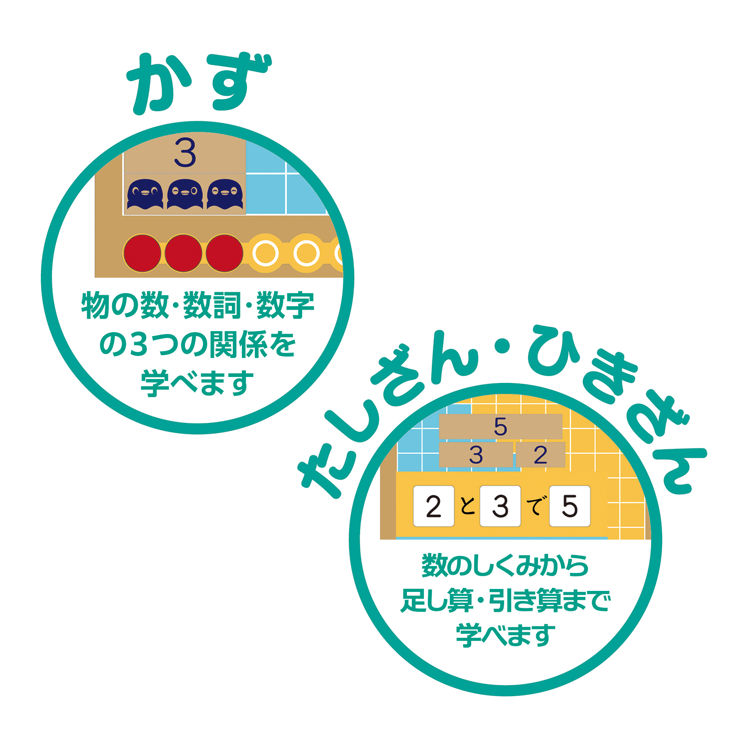幼児期に遊びながら「数の概念」を身につけると、算数も好きになります。本商品では、「かぞえる」「比べる」といった遊びを通して数に親しみ、自然に興味を育みます。ステップ式の学習で、”足し算””引き算”まで無理なく理解できるようになります。