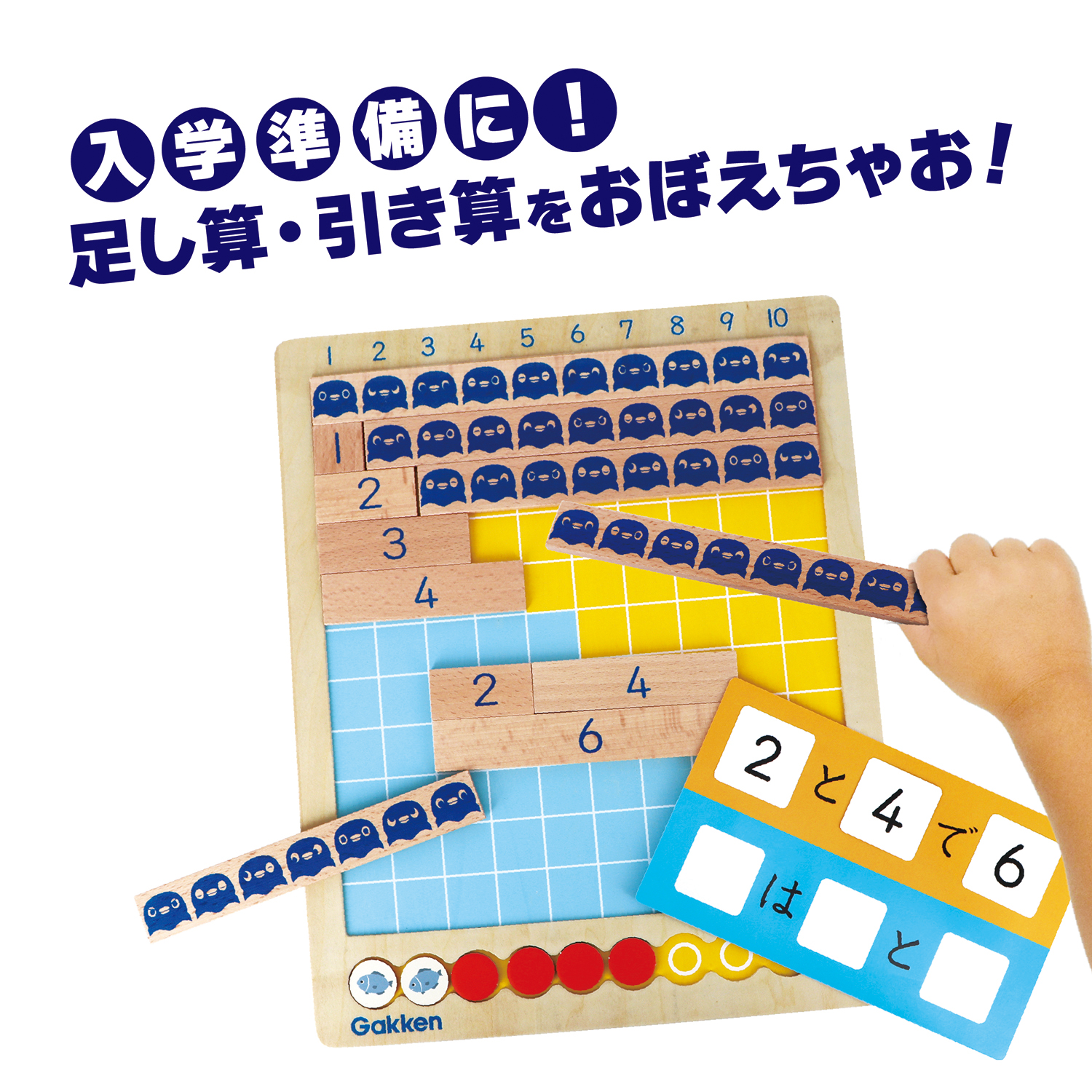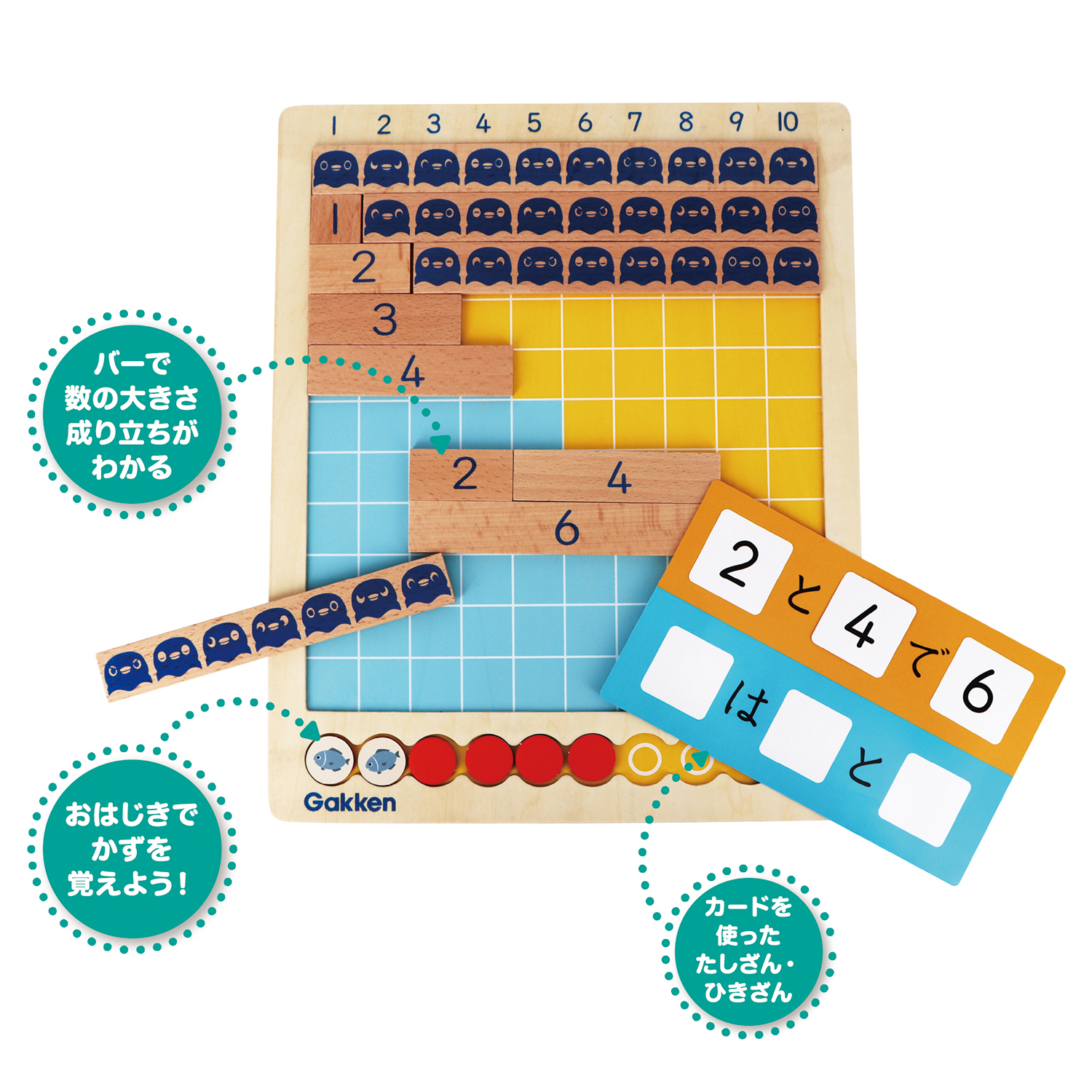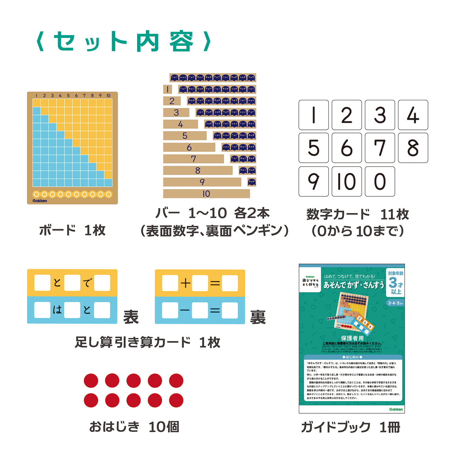 | 内容 | ボード1個、バー1~10各2本、おはじき10個、数字カード11枚(0~10)、足し算引き算カード1枚 |