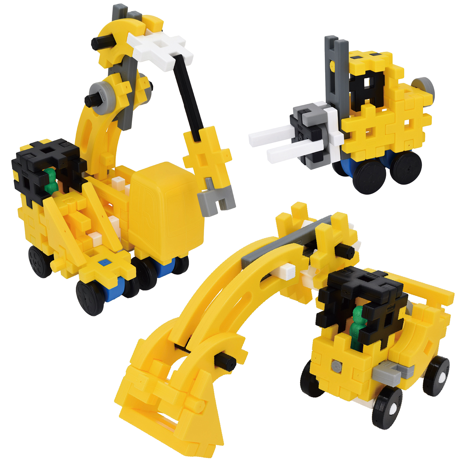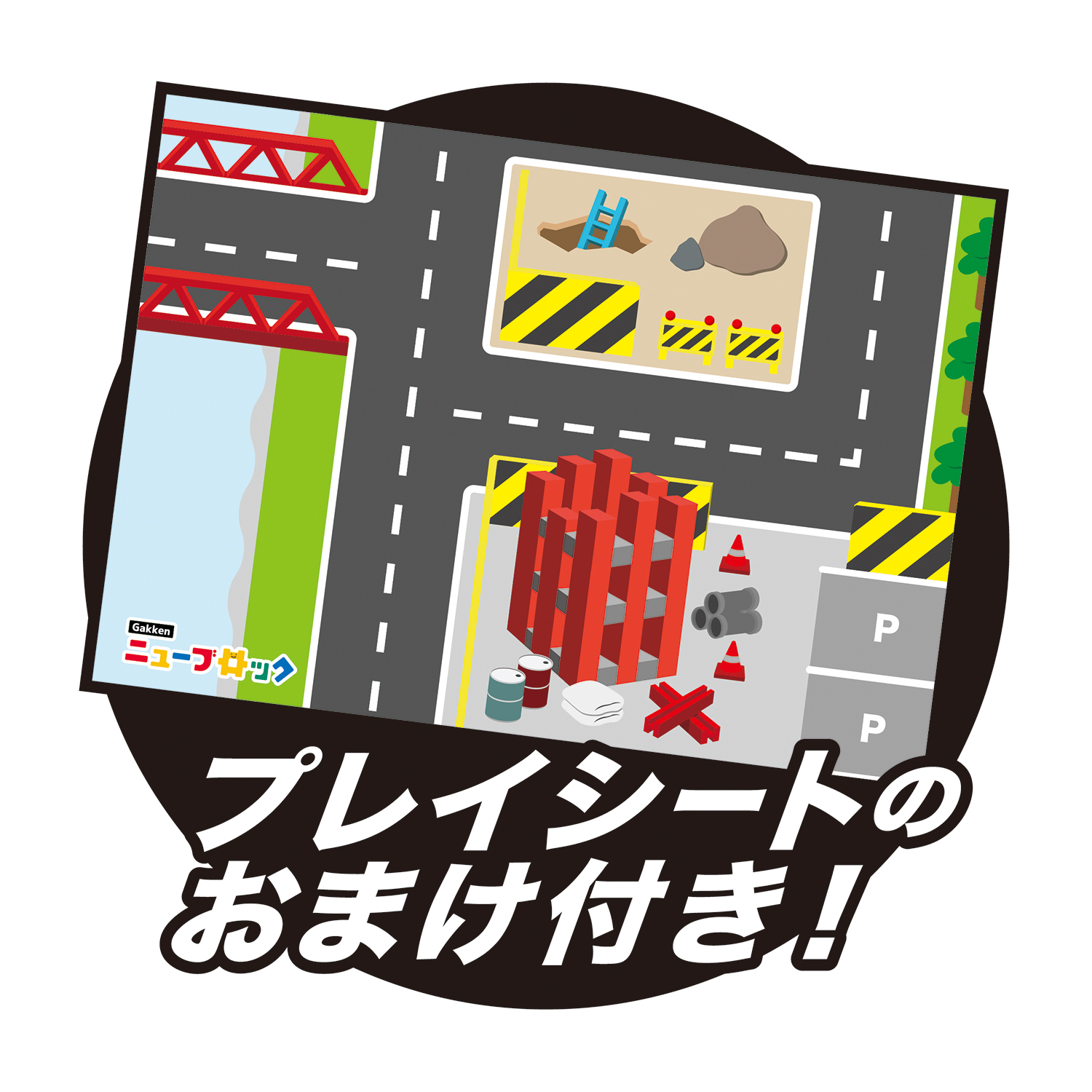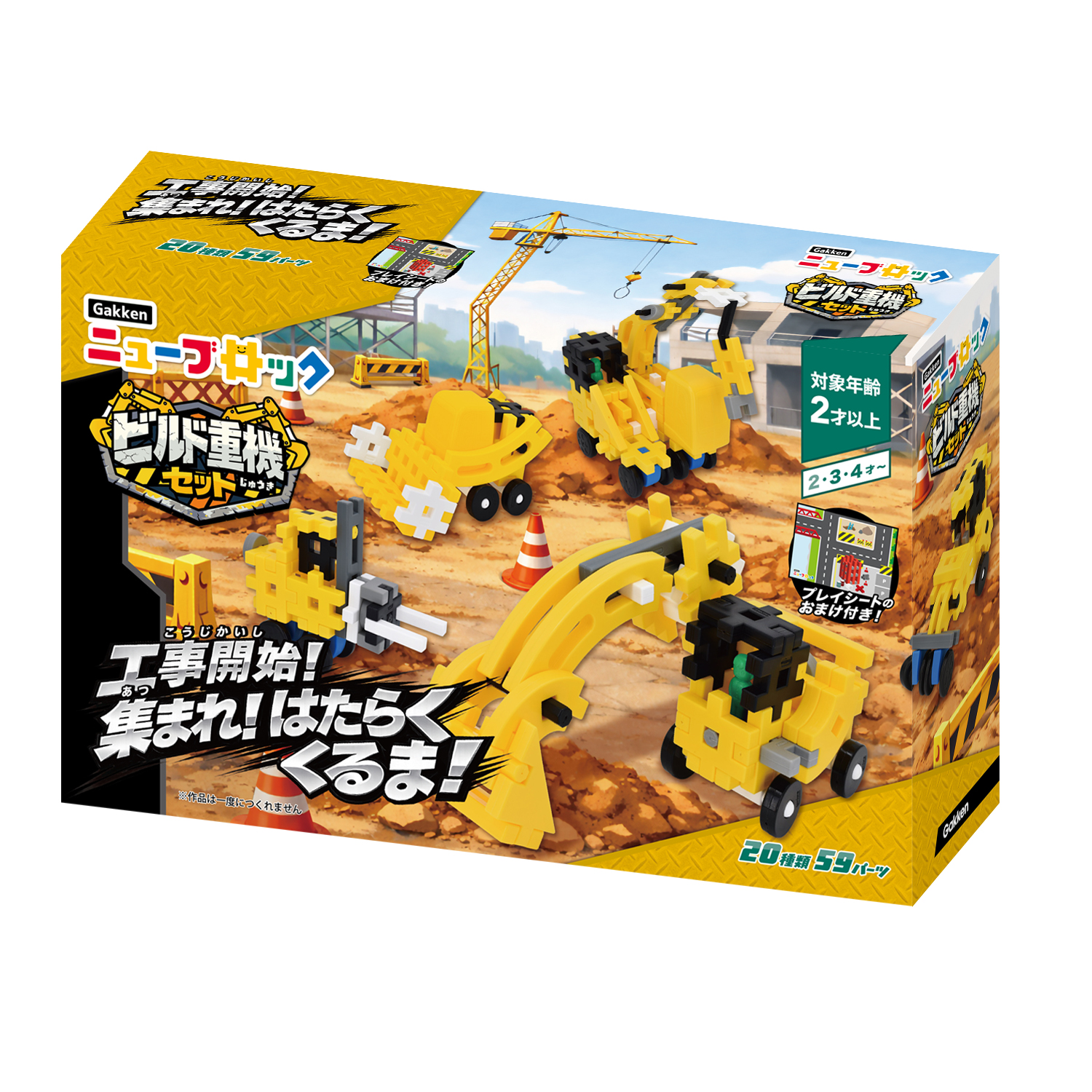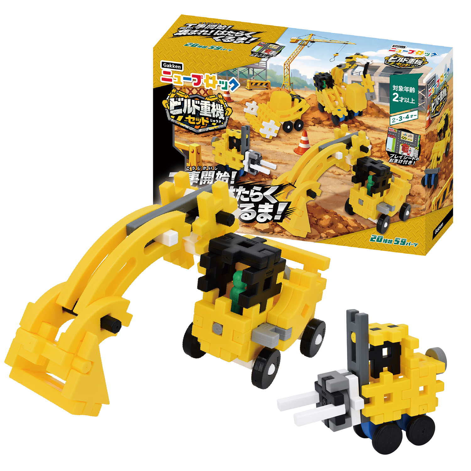 ニューブロックでショベルカーやブルドーザー、クレーン⾞など⼯事現場で活躍するくるまを作ることのできるセットです。パーツは20種類・59パーツのブロックが⼊っています。