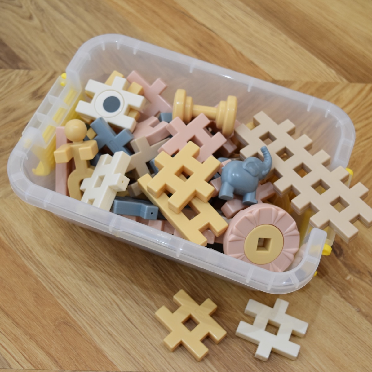 お片付けの習慣化に役立つケース入りのセットです。ケースの蓋はブロックをさして遊ぶことができる形状で、「ブロックをさして組む」練習ができます。