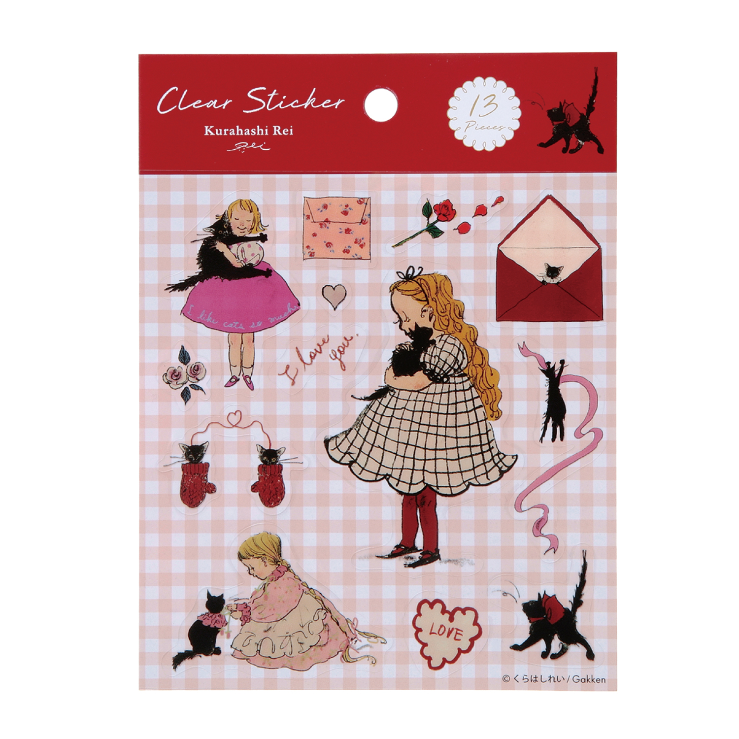 くらはしれいさんの繊細なタッチで描かれた猫や少女たちが、そっと日常に寄り添う、透明タイプのシールです。13ピース入りのシートタイプで、防水・UV加工の丈夫な素材を使用。使い方も自由自在!カラーペンやマスキングテープの上にも美しく映え、手帳やカードのデコレーションにもぴったりです。「だいすき」という作品がベースのシートに仕上げました。