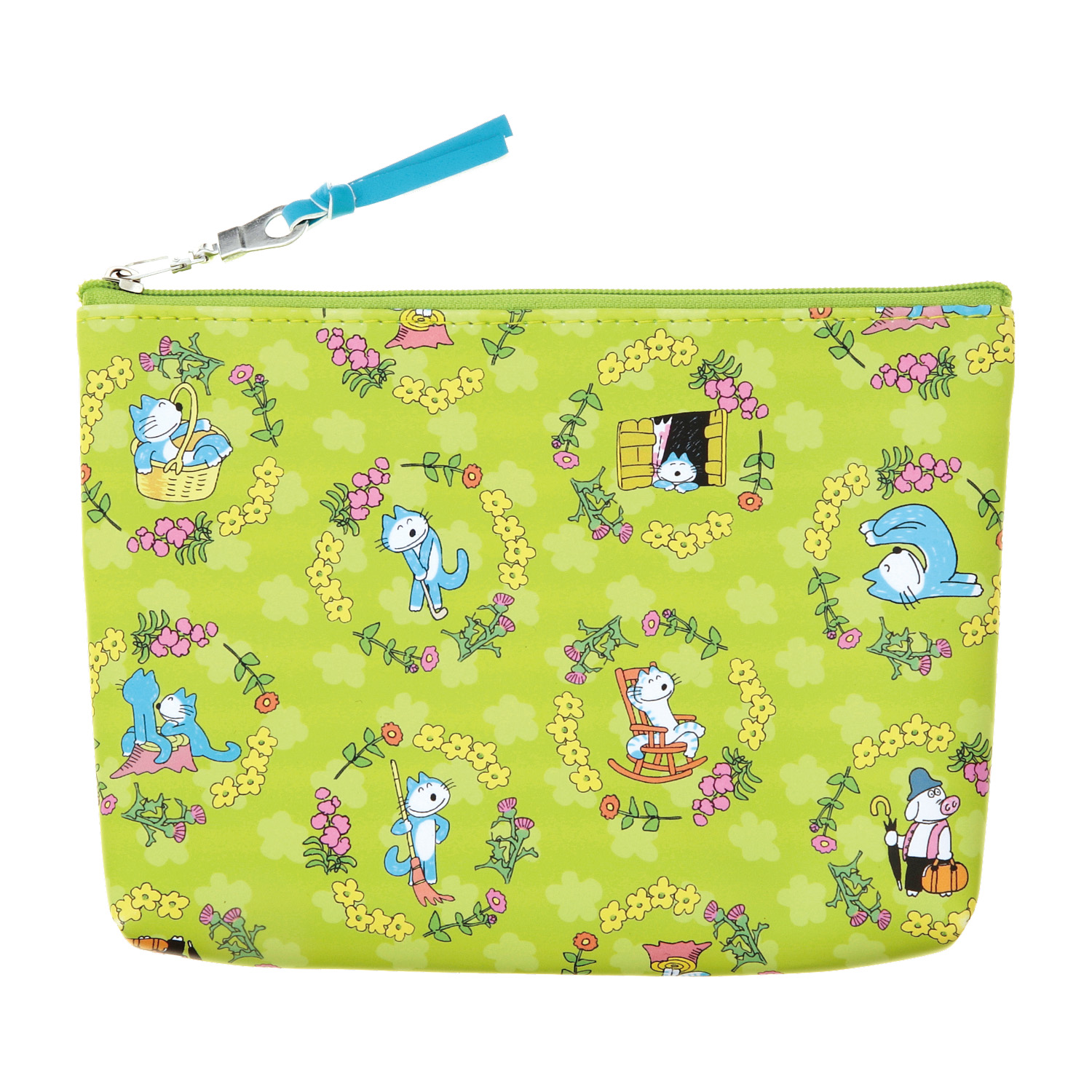 「11ぴきのねことぶた」に登場する、花々に囲まれたねこたちのイラストをもとにデザインしたオリジナルのポーチです。ちょっとした小物を入れるのに便利なサイズで、毎日の持ち歩きにも活躍します。こだわりのリボン引手がアクセントになっており、内側には小物整理に便利なポケット付きです。