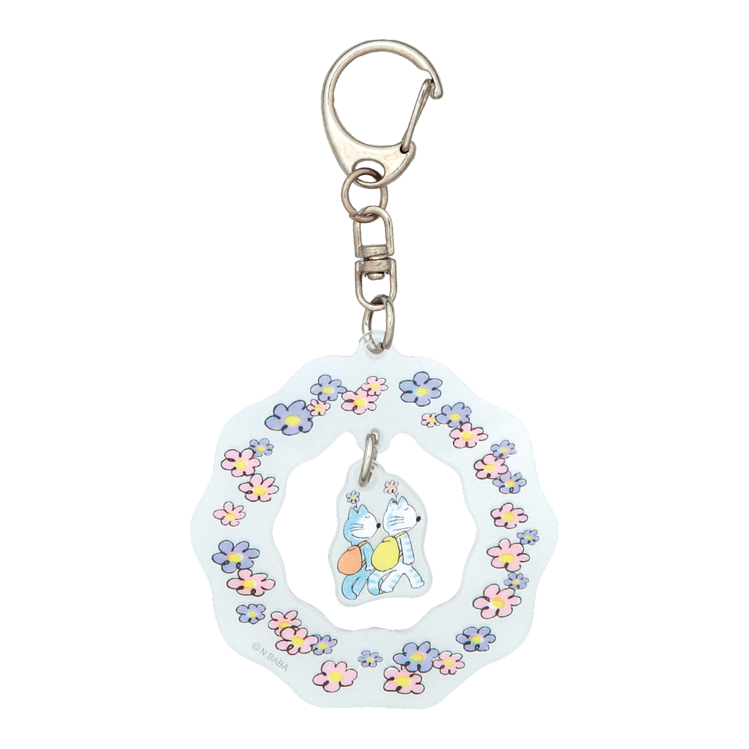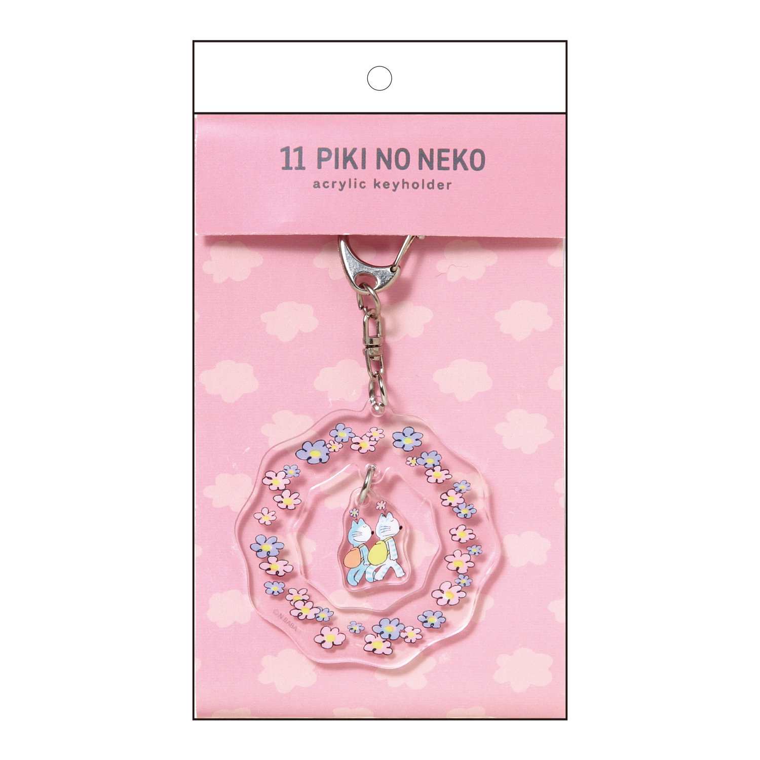 「11ぴきのねことふくろのなか」に登場する、頭に花をさしたねこたちをデザインしたダイカットのアクリルキーホルダーです。花に囲まれた中央のねこは揺れる仕様になっており、動きのあるかわいらしさを楽しめます。