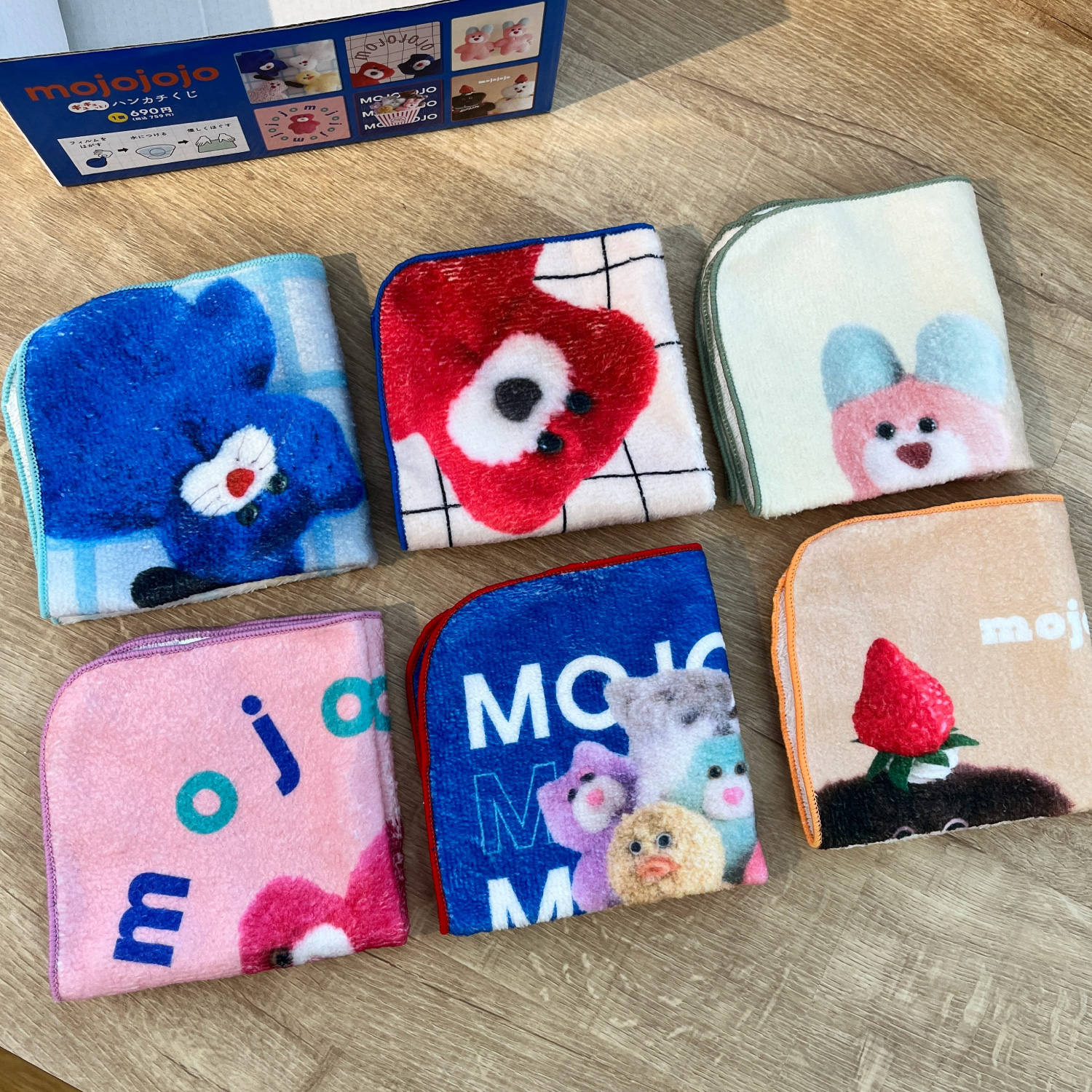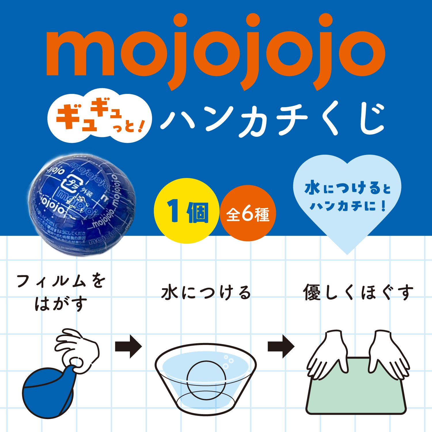 「mojojojo ギュギュっと!ハンカチくじ」は、ボール状に小さく圧縮されたハンカチです。パッケージフィルムを剥がして、水に濡らしながらやさしくほぐすと、約24×24cmのハンカチが出てきます。デザインは全部で6種類! 6つの柄のうち、どれか1つがランダムで入っています。どの柄が出るかな?とくじ感覚でお楽しみください。