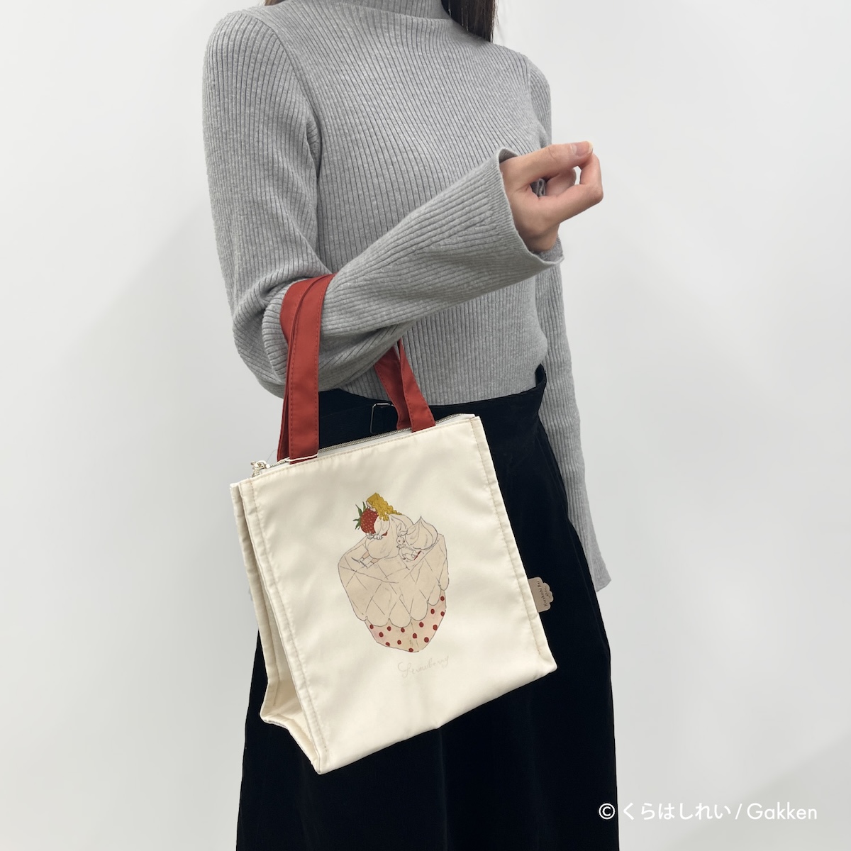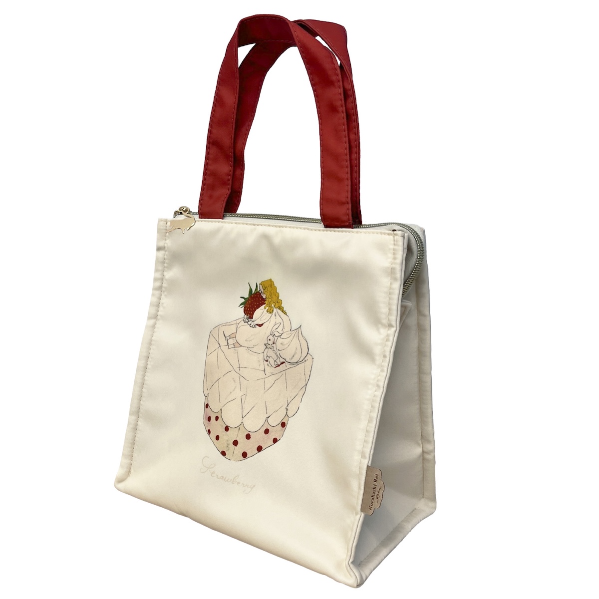内側は保冷仕様で、お弁当やドリンクをしっかりキープ。さらに、猫型の引手チャームがアクセントになっていて、バッグを開けるたびに癒されるデザイン。