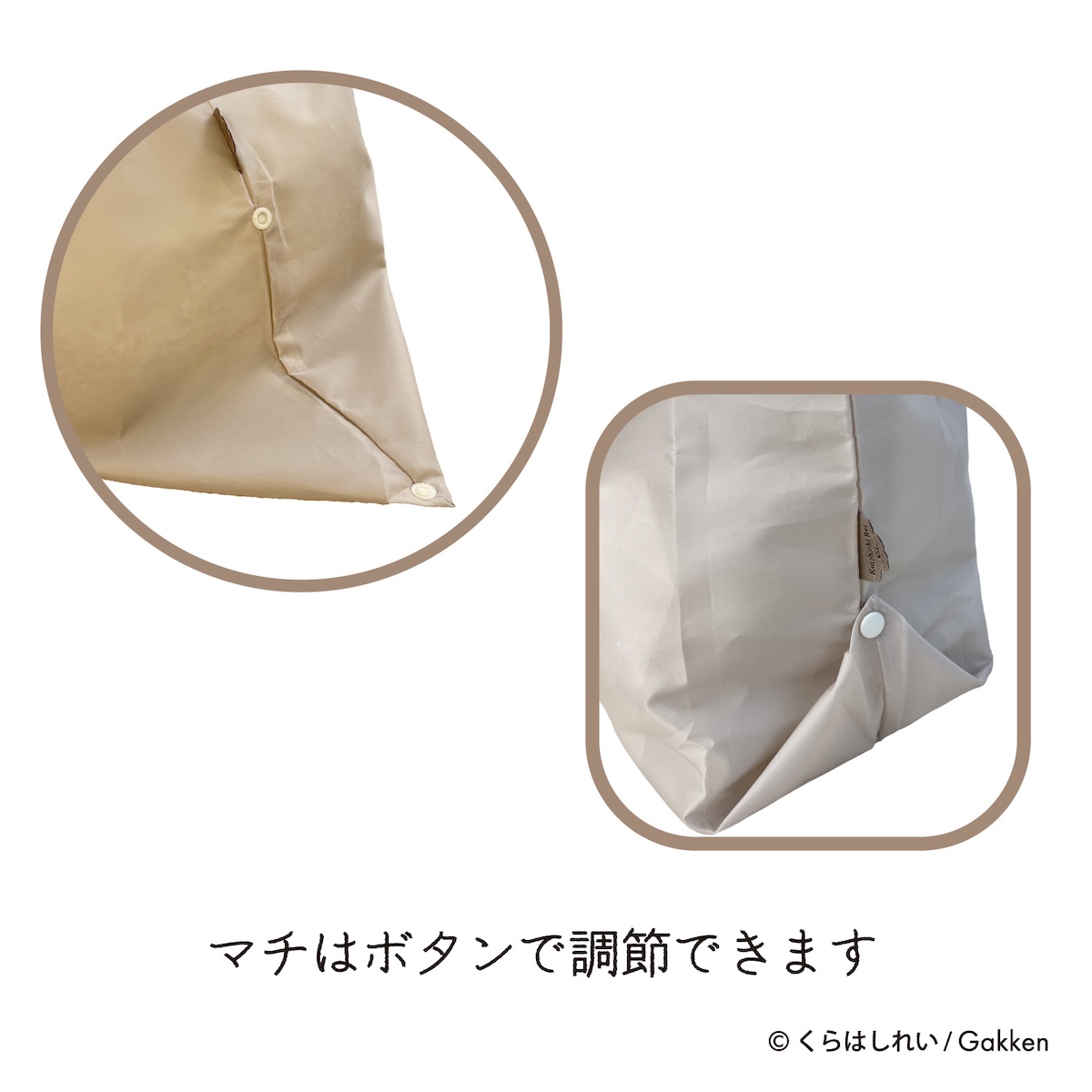 マチ付きで、ボタンを留めることによってマチ調整可能な仕様になっています。