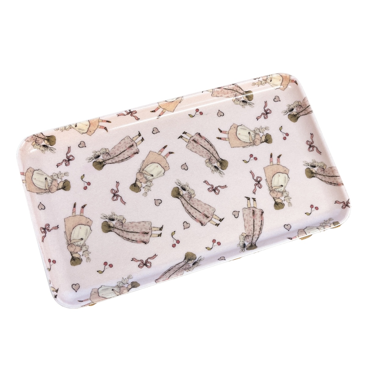 繊細なタッチで描かれた女の子やモチーフが全面にちりばめられた総柄デザインは、まるで絵本のページを閉じ込めたようなかわいさ。