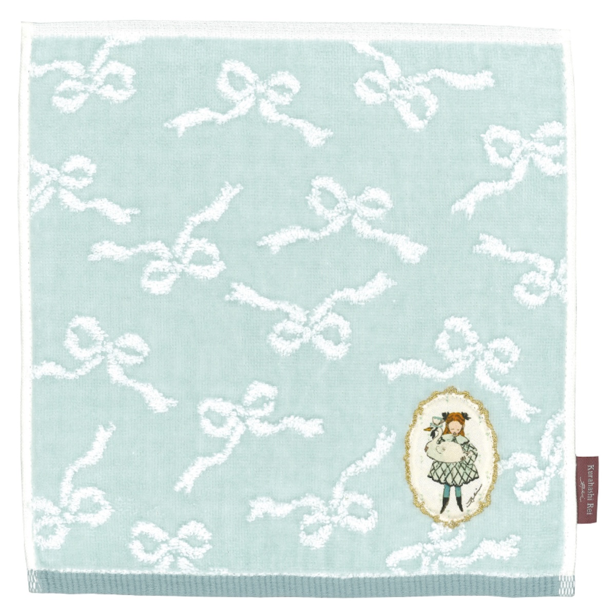 くらはしれいさんが描く女の子とリボンが彩る、ふんわり優しいハンカチ。