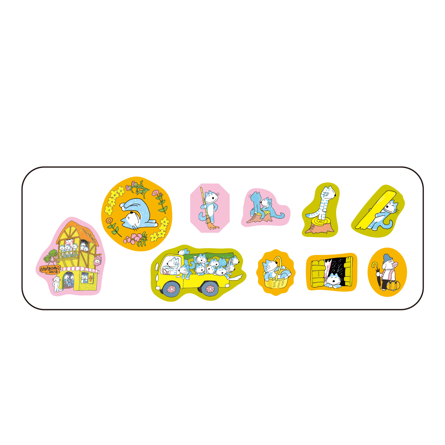 「11ぴきのねことぶた」の絵本イラストを使用した、全10種・計40枚入りのシールセットです。マスキングテープ素材で、貼ってはがせる便利な仕様。ほんのり透ける質感を楽しめるため、手帳やノートのデコレーションはもちろん、透け感を活かしたオリジナルアレンジを楽しめます。