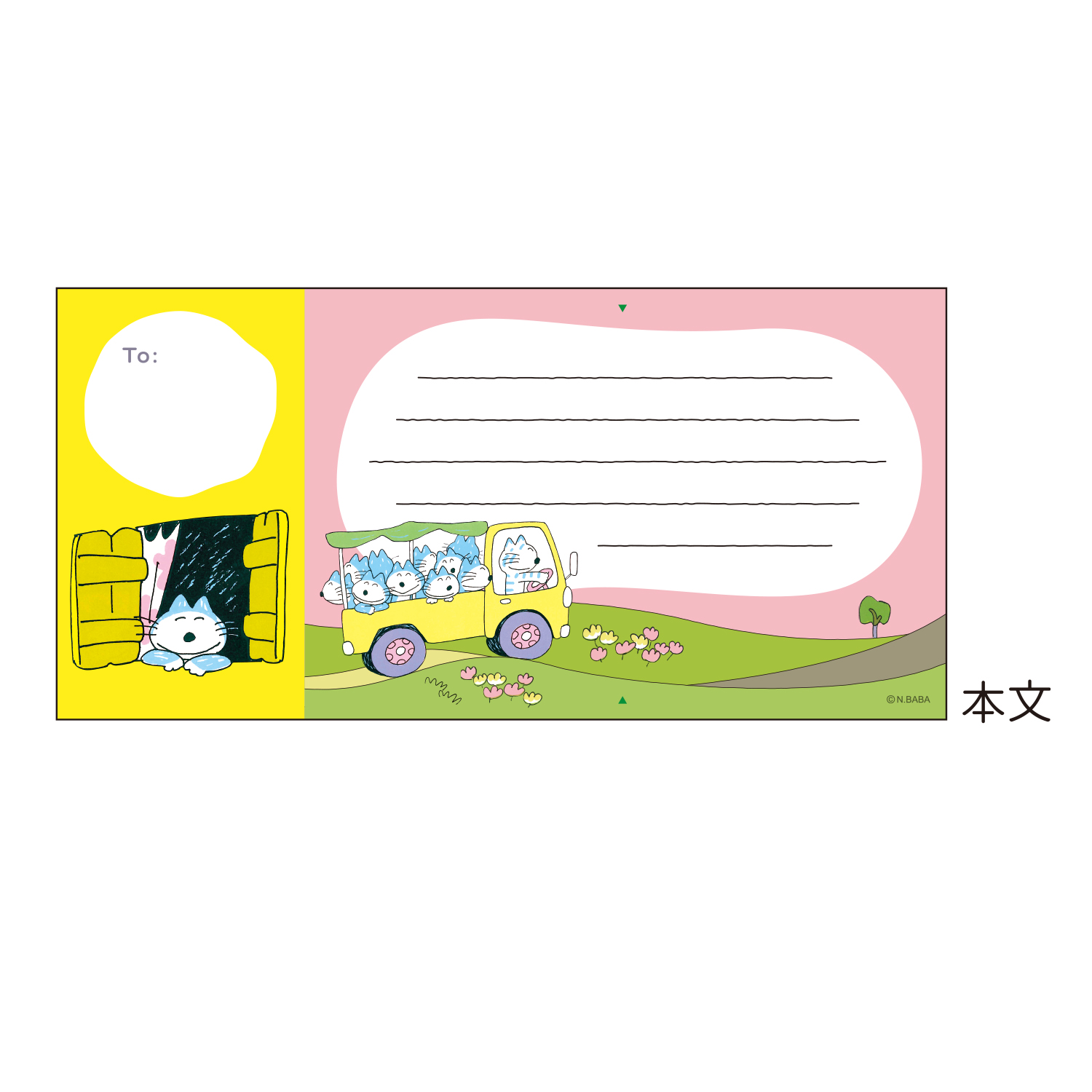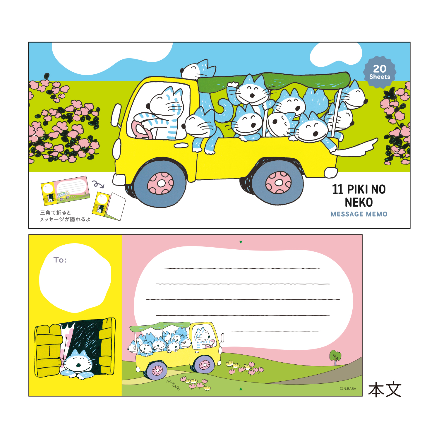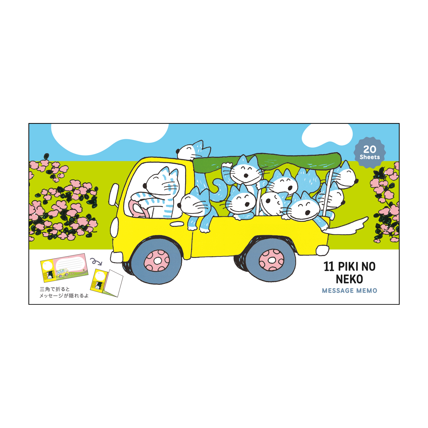 「11ぴきのねことぶた」に登場するトラックに乗っているねこ達の姿がかわいいメッセージが書けるメモです。▼の部分で折るとメッセージを隠せる仕様です。